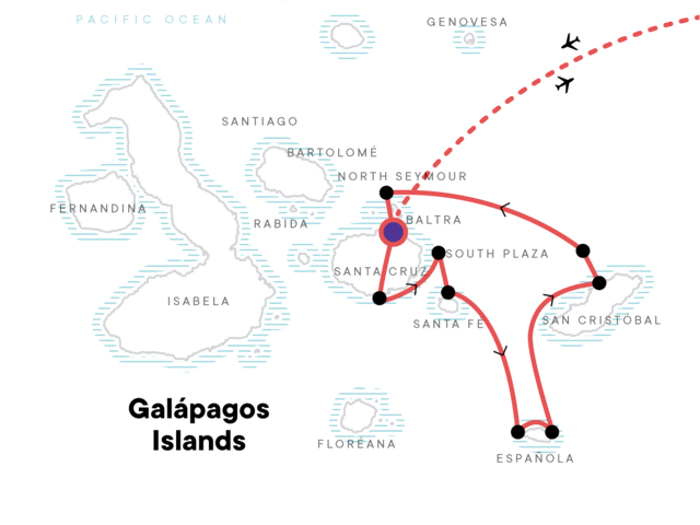 Flights to either of the airports in the Galapagos leave early in the morning on Day 2 and get you into the islands in the early afternoon. Flights back to the mainland depart between 10:00am and 1:30pm arriving in the early evening. Please be aware of the weight restrictions for baggage on these flights: 23 kg (50 lbs) for checked luggage, 8 kg (17.5 lbs) for carry on.