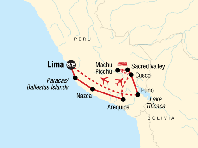6. There may be some departures of this trip that will operate in reverse. All inclusions and destinations visited remain exactly the same, just done in a different order, as per the following: Day 1 - Lima, Days 2-3 - Puno, Days 4-5 - Cusco, Day 6 - Urubamba, Day 7 - Aguas Calientes, Day 8 - Machu Picchu/Cusco, Days 9-10 - Arequipa, Days 11-12 - Nazca, Day 13 - Paracas, Day 14 - Lima, Day 15 - Tour ends in Lima.