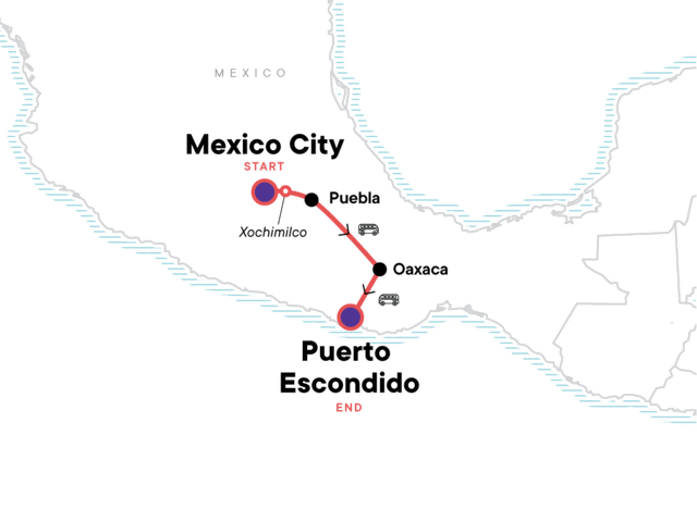 Your Welcome Moment: Welcome Moment - Meet Your CEO and Group. Insiders tour of Mexico City with included street food lunch. Boat ride along the ancient canals of Xochimilco. Typical food experience meal in Oaxaca with tequila and mezcal tastings. Beach time at Puerto Escondido. CEO-led orientation walk in Puerto Escondido. All transport between destinations and to/from included activities.
